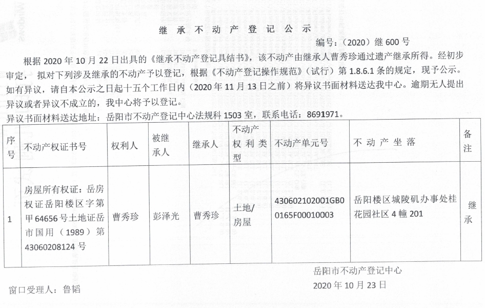 继承(受遗赠)不动产登记公告(曹秀珍)