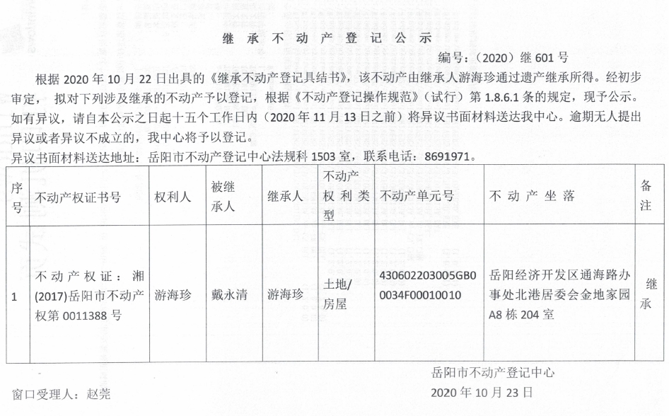 继承(受遗赠)不动产登记公告(游海珍)