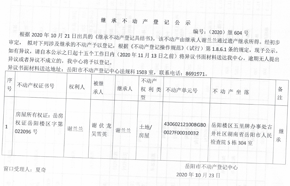 继承(受遗赠)不动产登记公告(谢兰兰)