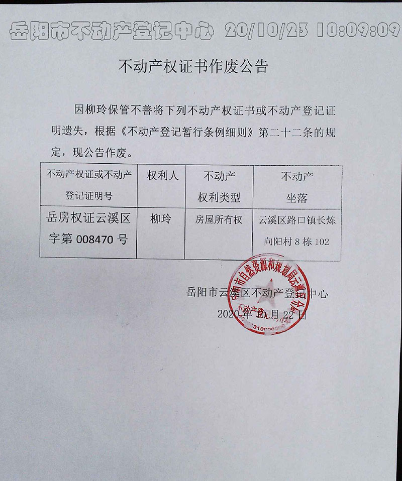 不动产权证书/登记证明作废公告(柳玲)