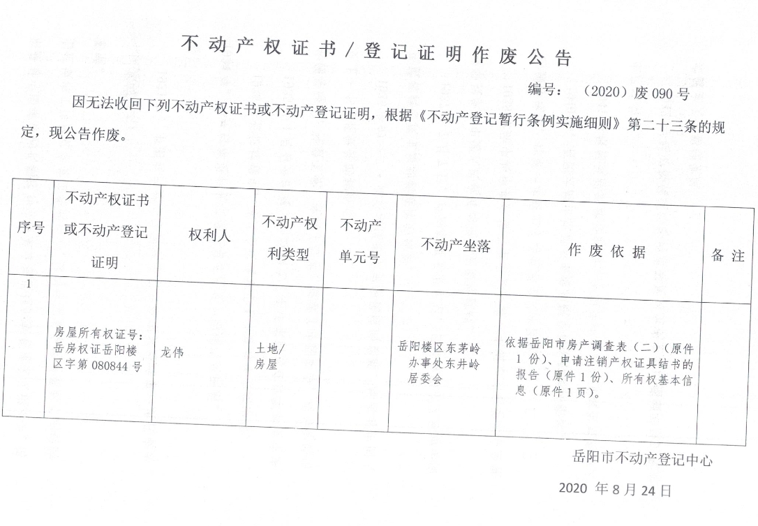 不动产权证书/登记证明作废公告(龙伟)