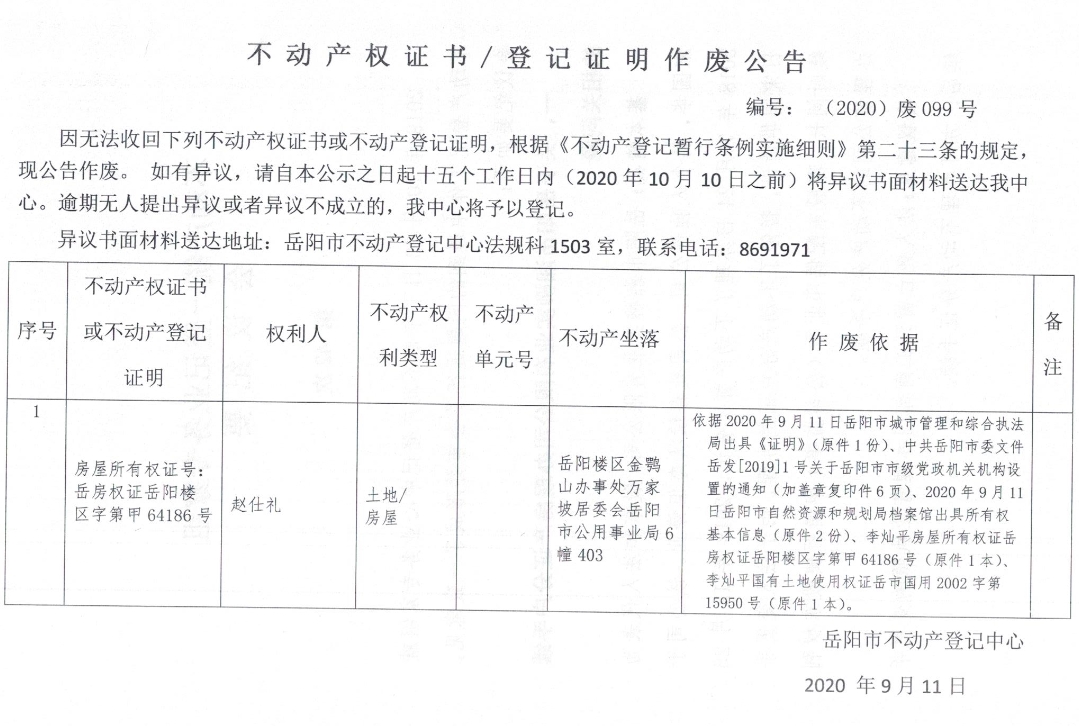 不动产权证书/登记证明作废公告(赵仕礼)