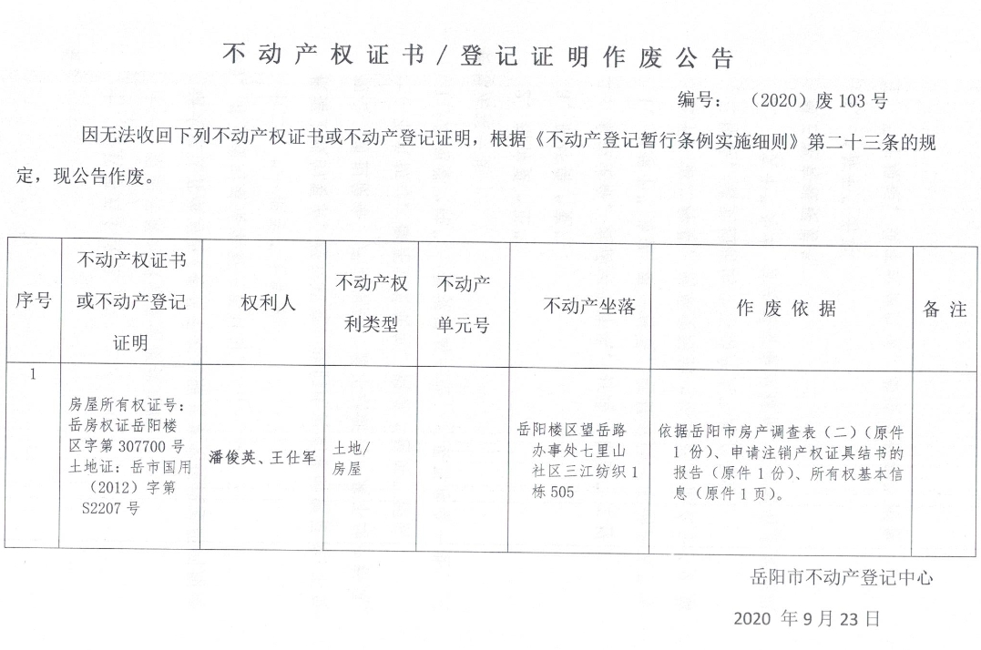 不动产权证书/登记证明作废公告(潘俊英、王仕军)