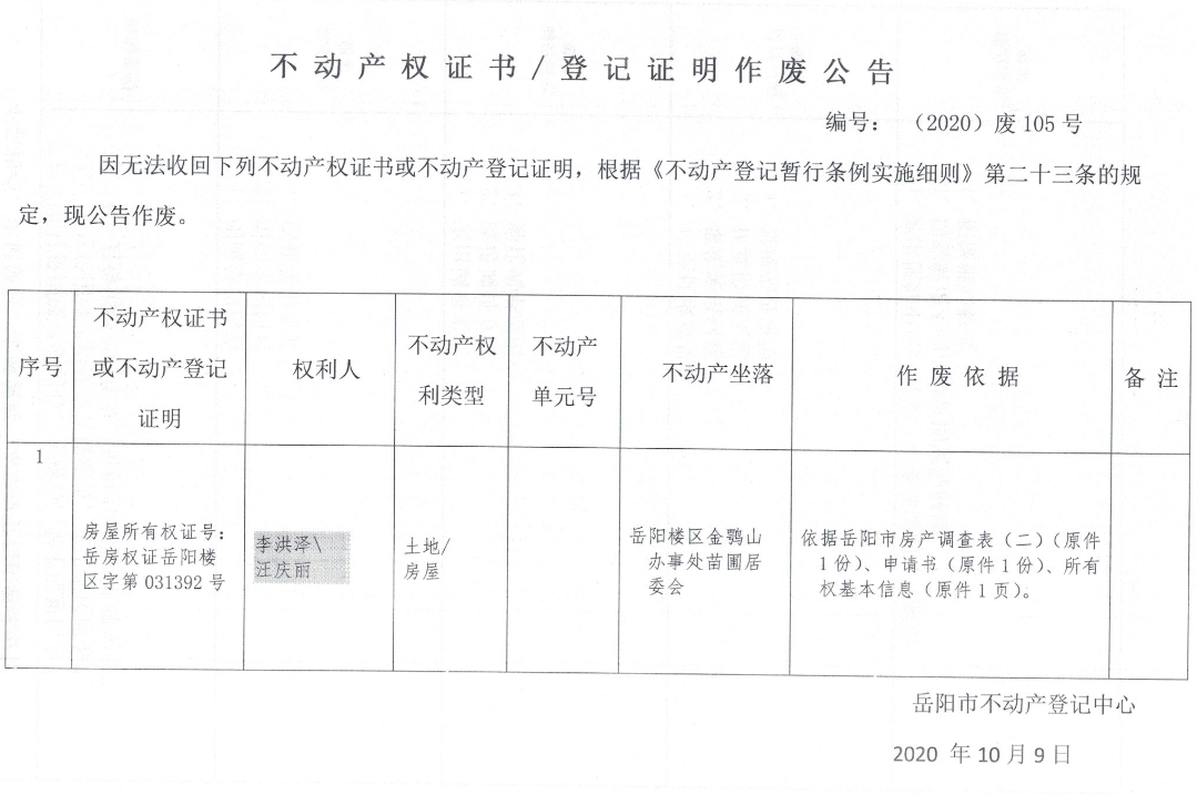 不动产权证书/登记证明作废公告(李洪泽、汪庆丽)