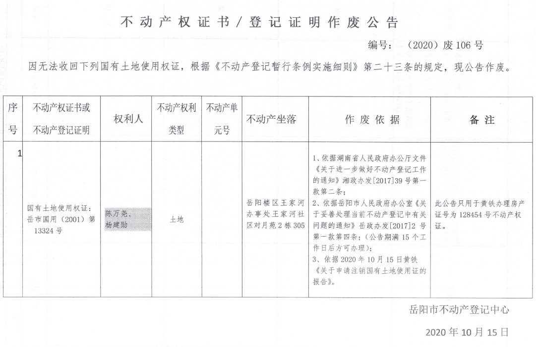 不动产权证书/登记证明作废公告(陈万尧、杨建勋)