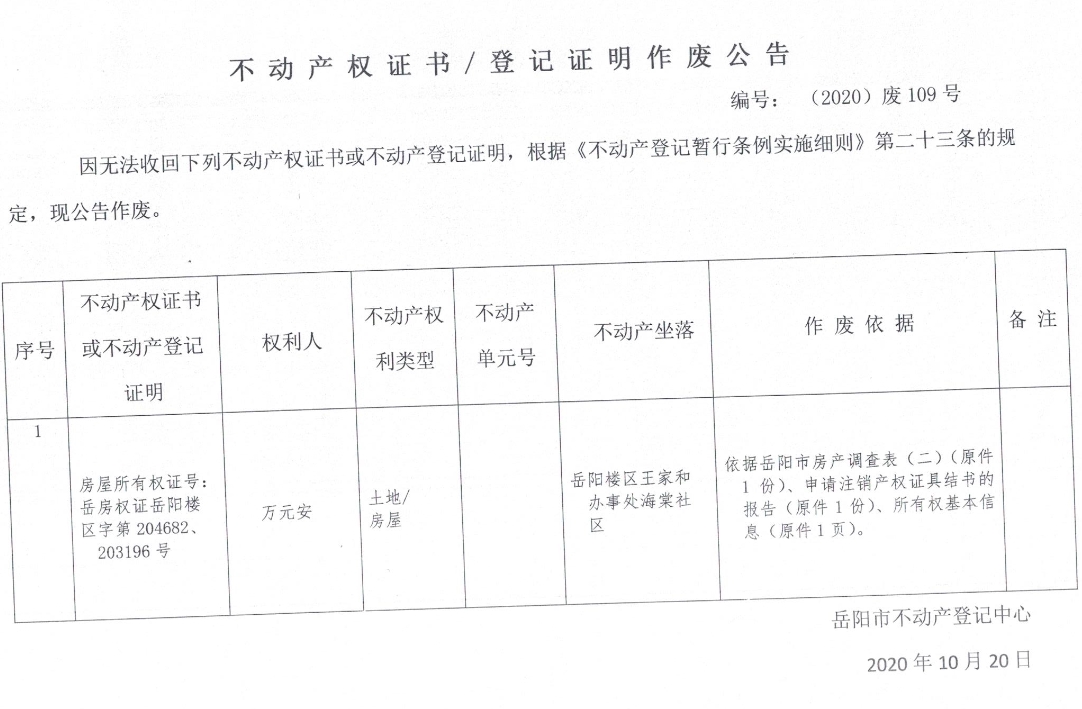 不动产权证书/登记证明作废公告(万元安)