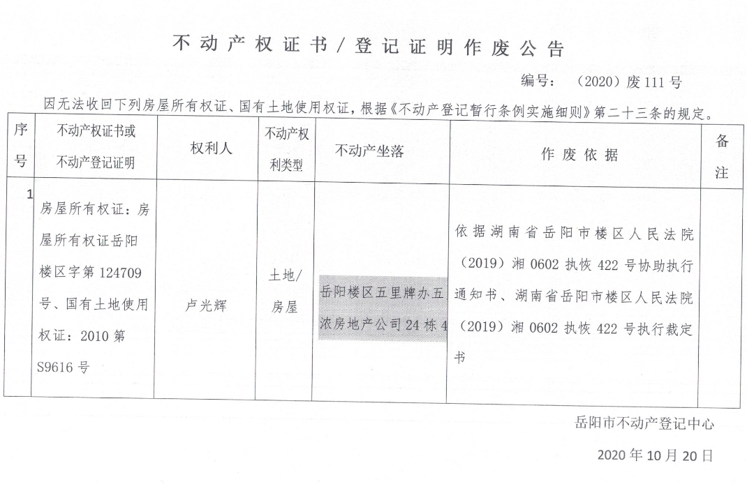 不动产权证书/登记证明作废公告(卢光辉)