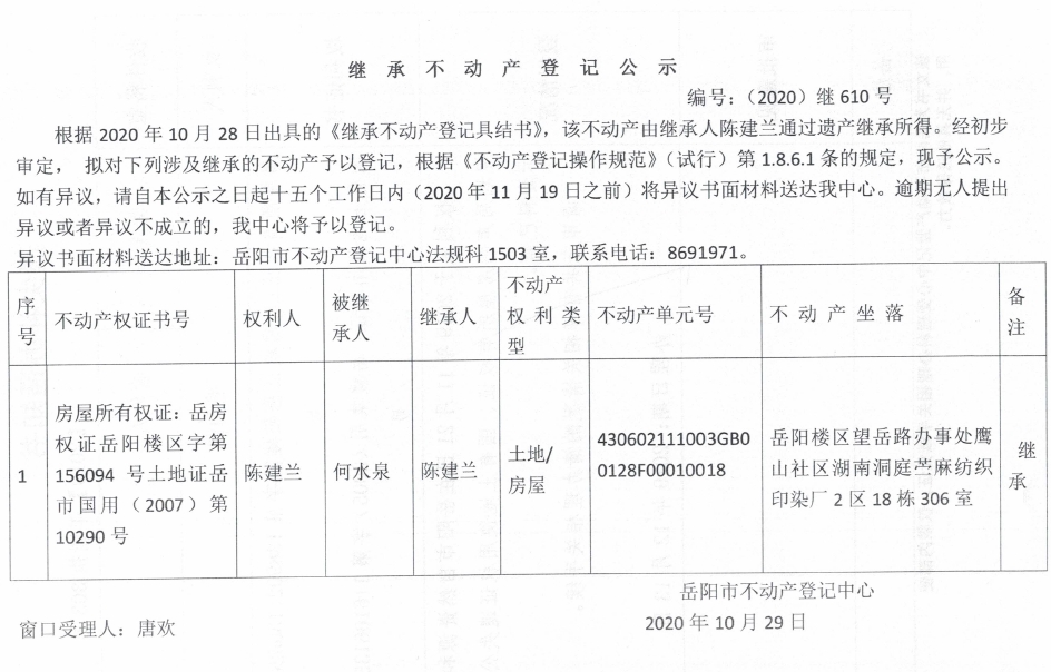 继承(受遗赠)不动产登记公告(陈建兰)