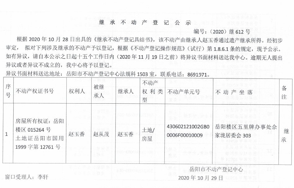 继承(受遗赠)不动产登记公告(赵玉香)