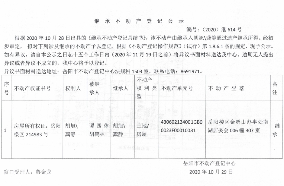 继承(受遗赠)不动产登记公告(胡旭)