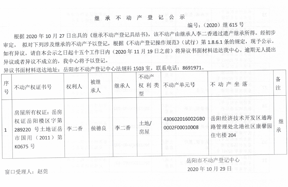 继承(受遗赠)不动产登记公告(李二香)