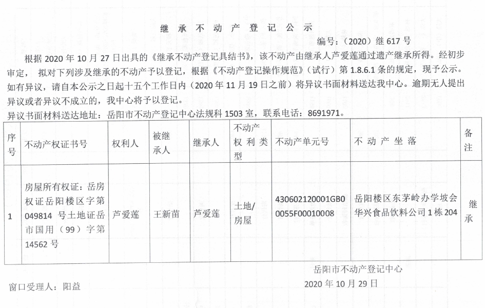 继承(受遗赠)不动产登记公告(芦爱莲)