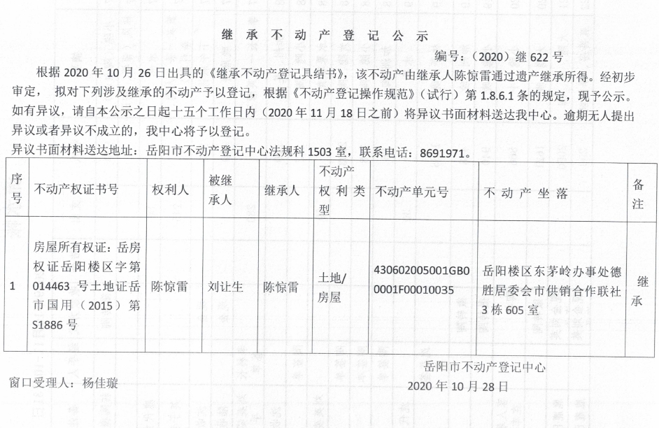 继承(受遗赠)不动产登记公告(陈惊雷)