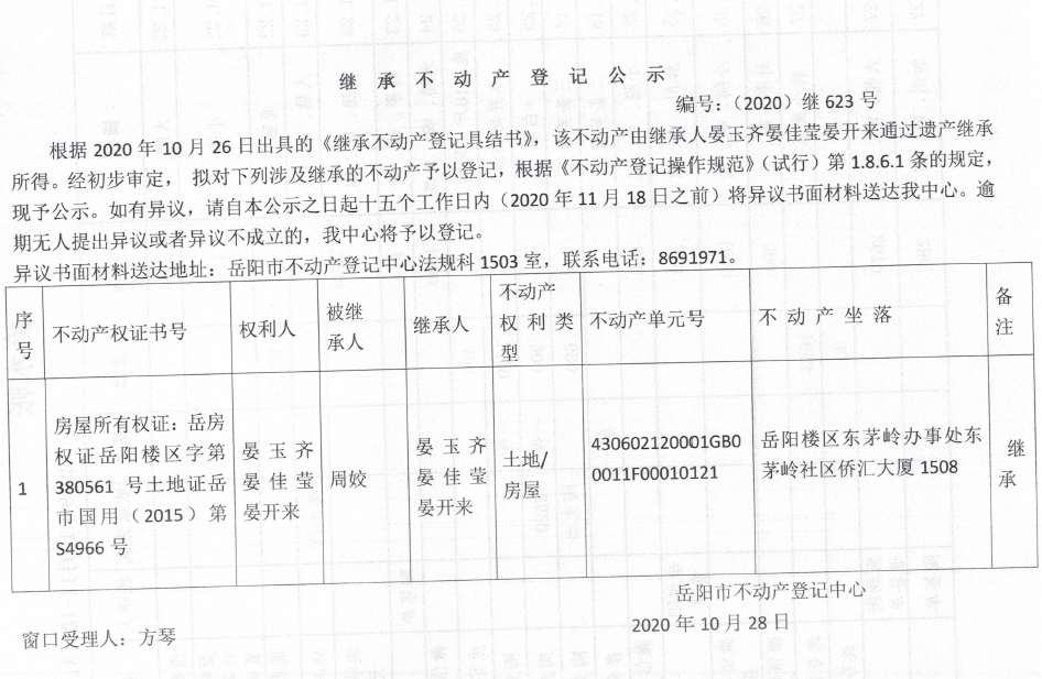 继承(受遗赠)不动产登记公告(宴开来)