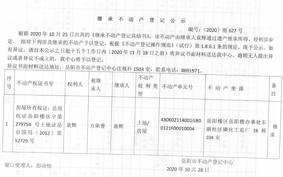 继承(受遗赠)不动产登记公告(袁辉)