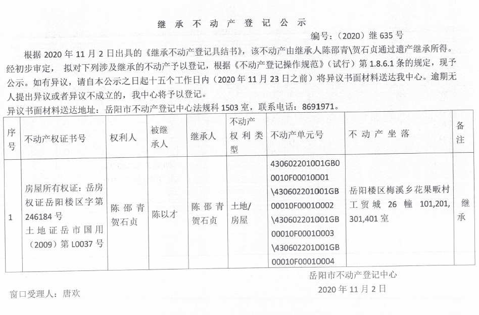 继承(受遗赠)不动产登记公告(贺石贞)