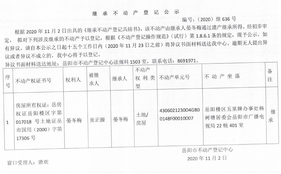 继承(受遗赠)不动产登记公告(晏冬梅)