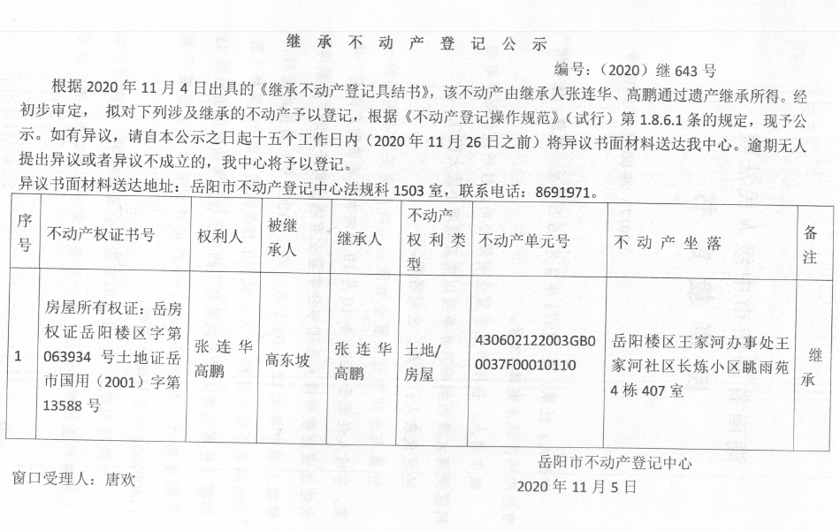 继承(受遗赠)不动产登记公告(张连华)