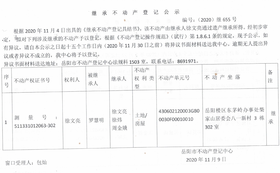 继承(受遗赠)不动产登记公告(徐文亮)