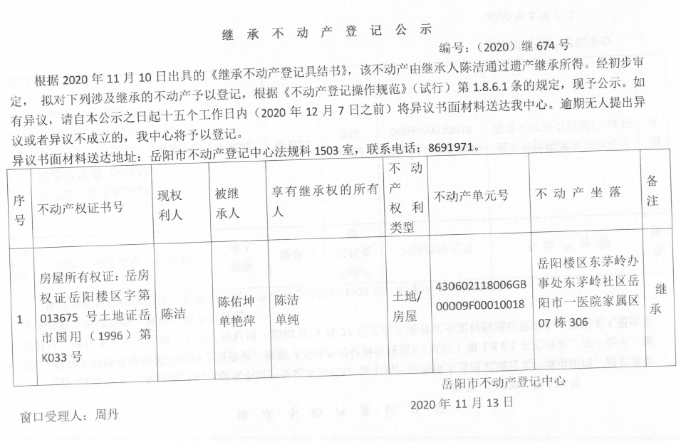 继承(受遗赠)不动产登记公告(陈洁)