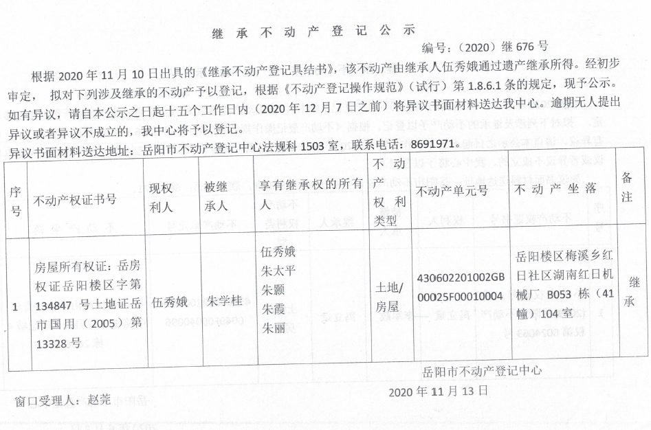 继承(受遗赠)不动产登记公告(伍秀娥)
