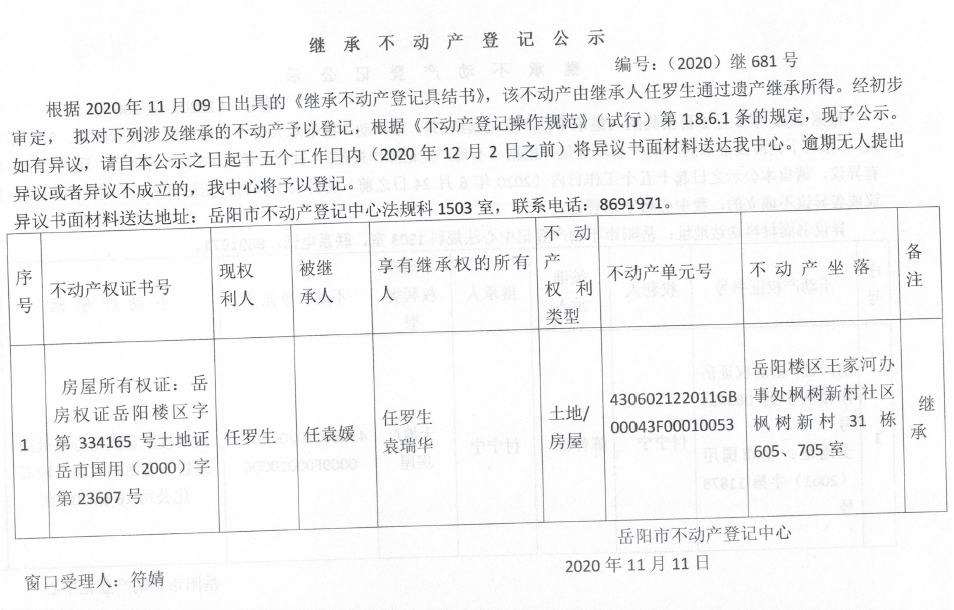 继承(受遗赠)不动产登记公告(任罗生)