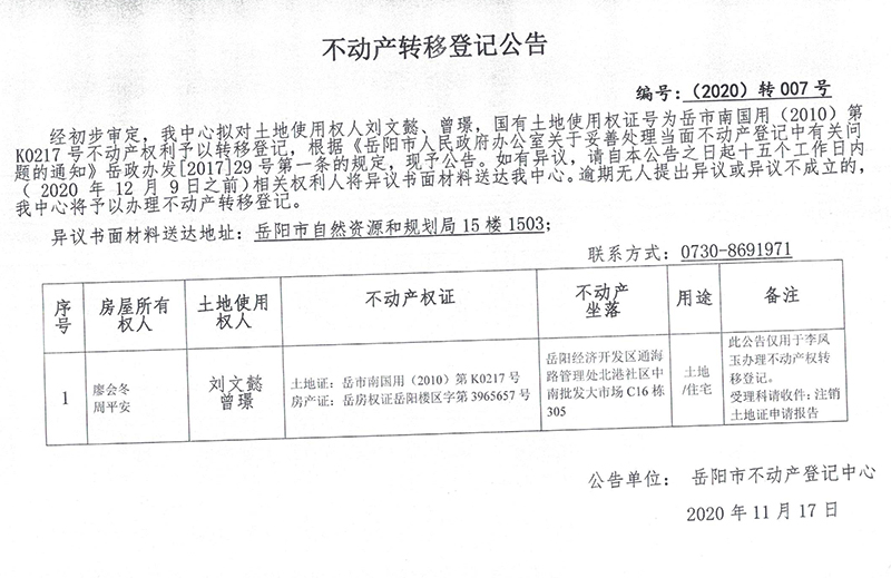 不动产转移登记公告 编号:(2020)转007号(刘文懿、曾璟)