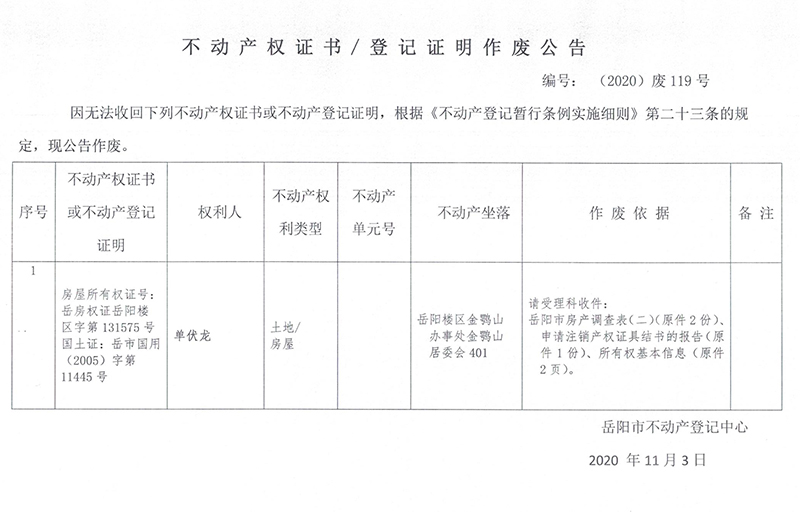 不动产权证书/登记证明作废公告(单伏龙)