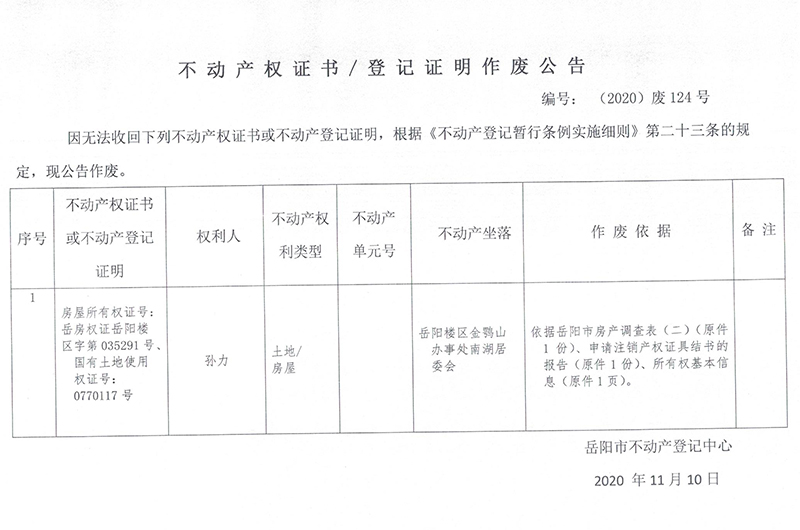 不动产权证书/登记证明作废公告(孙力)