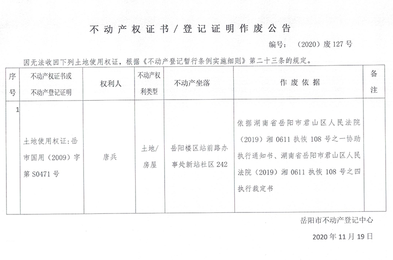 不动产权证书/登记证明作废公告(唐兵)