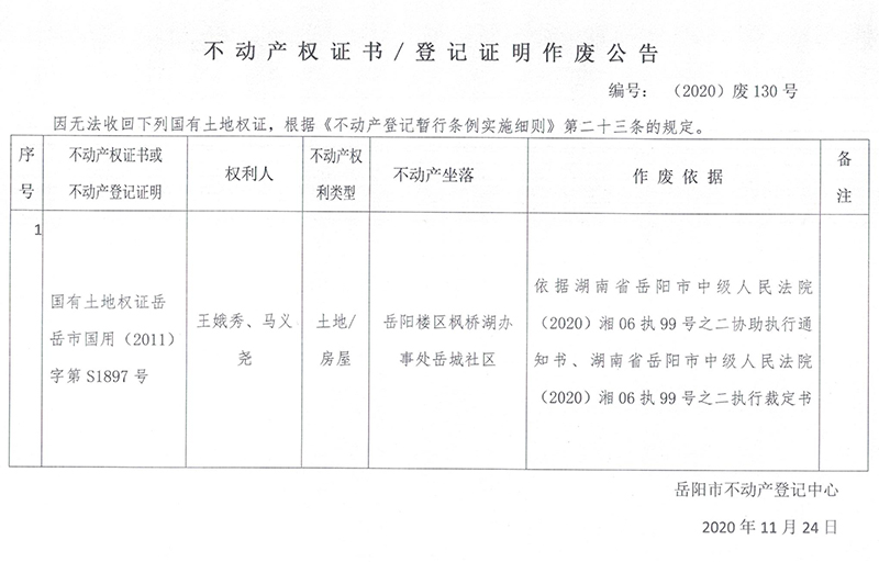 不动产权证书、登记证明作废公告 编号: (2020)废130号(王娥秀、马义尧)