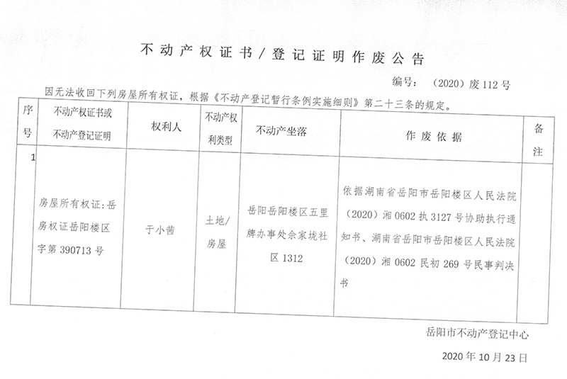 不动产权证书/登记证明作废公告(于小茜)