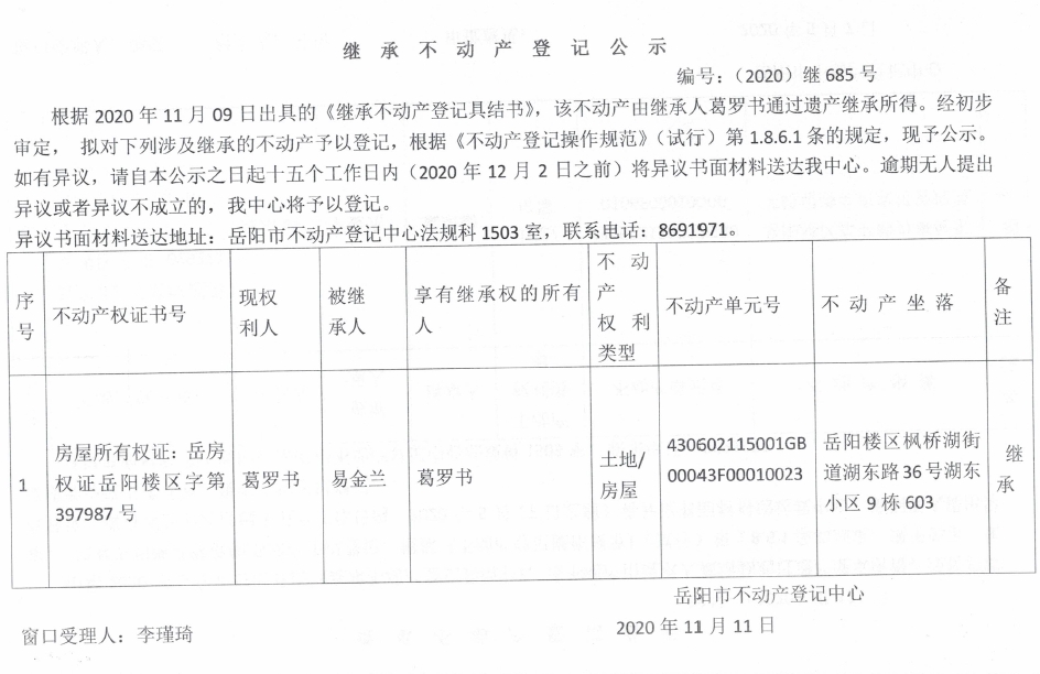 继承(受遗赠)不动产登记公告(葛罗书)