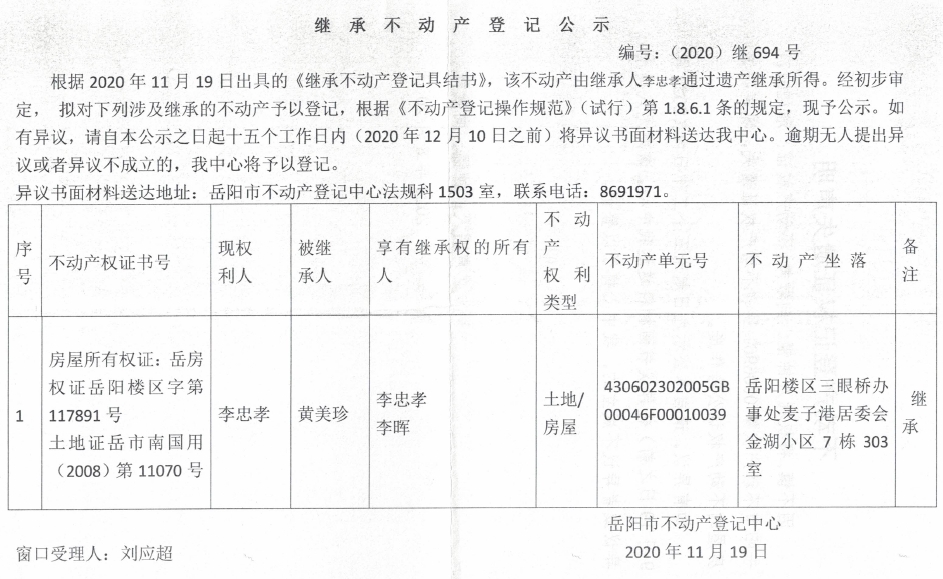继承(受遗赠)不动产登记公告(李忠孝)