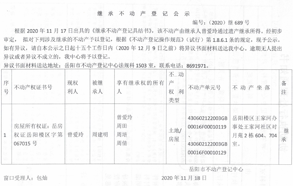 继承(受遗赠)不动产登记公告(曾爱玲)