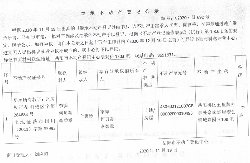 继承(受遗赠)不动产登记公告(李碧章)