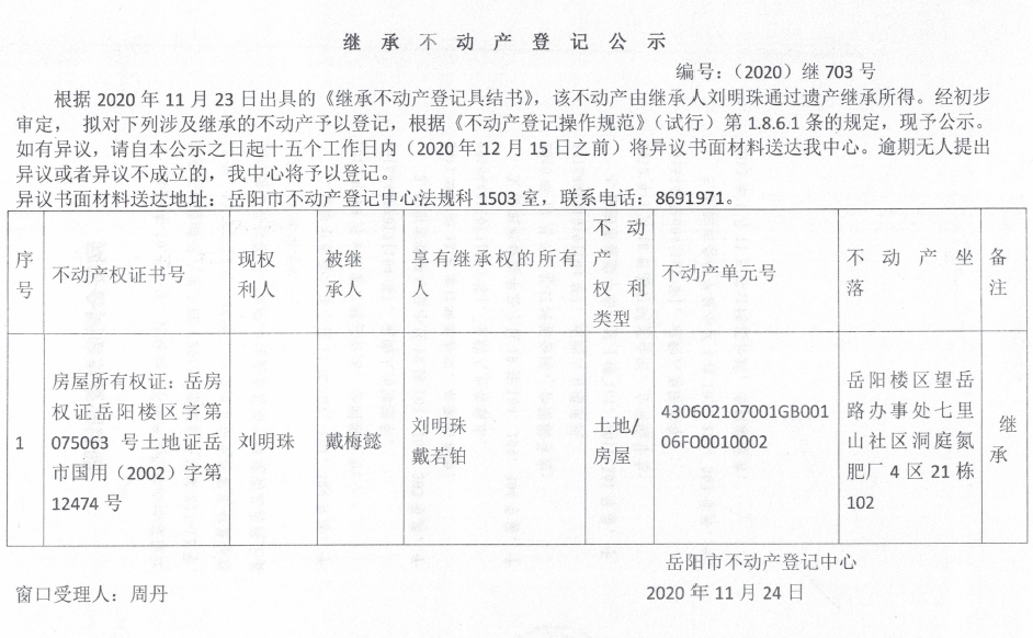 继承(受遗赠)不动产登记公告(刘明珠)