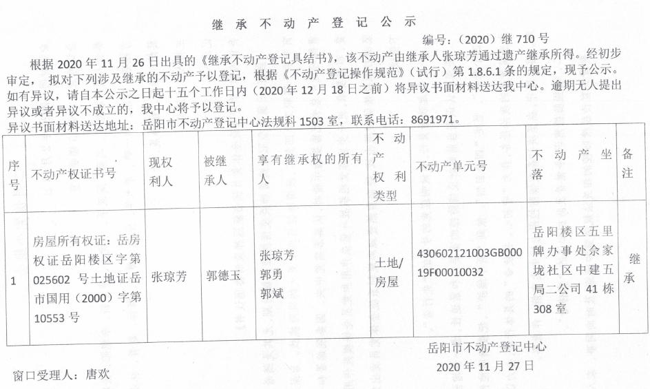 继承(受遗赠)不动产登记公告(张琼芳)