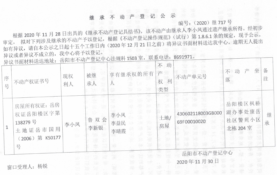 继承不动产登记公示 编号:(2020)继717号(李小凤)