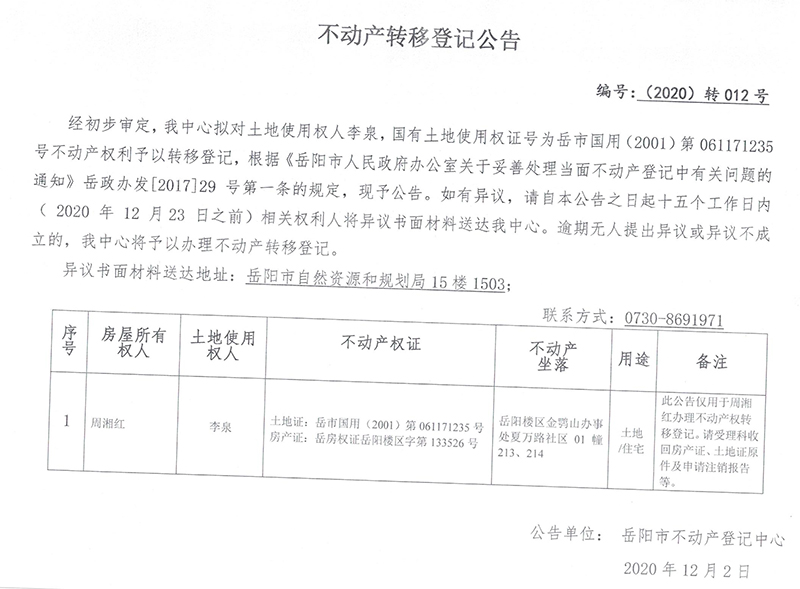 不动产转移登记公告 编号: (2020)转012号(李泉)