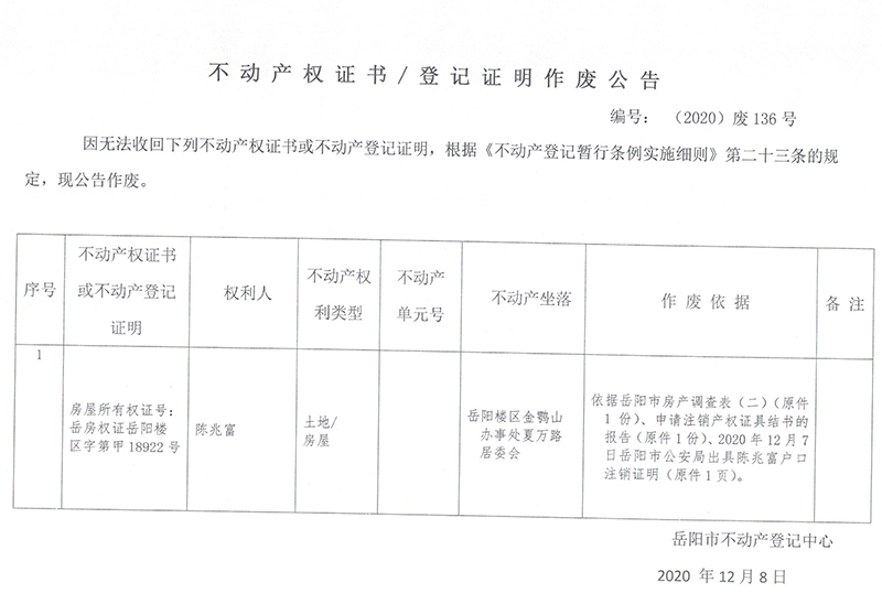 不动产权证书/登记证明作废公告(陈兆富)