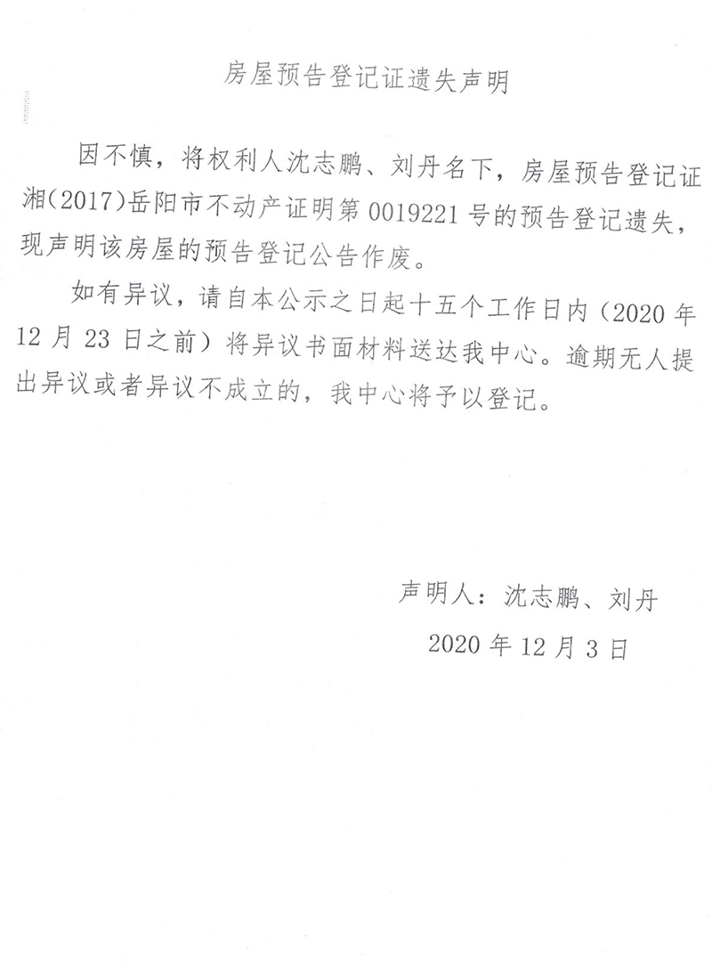 房屋预告登记证遗失声明(沈志鹏、刘丹)