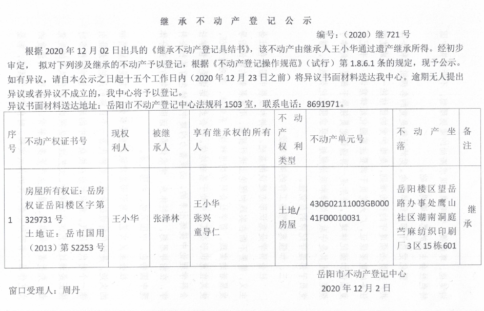 继承(受遗赠)不动产登记公告(王小华)