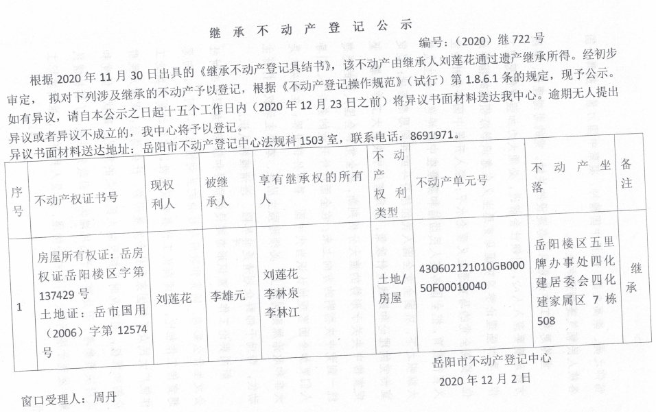 继承(受遗赠)不动产登记公告(刘莲花)