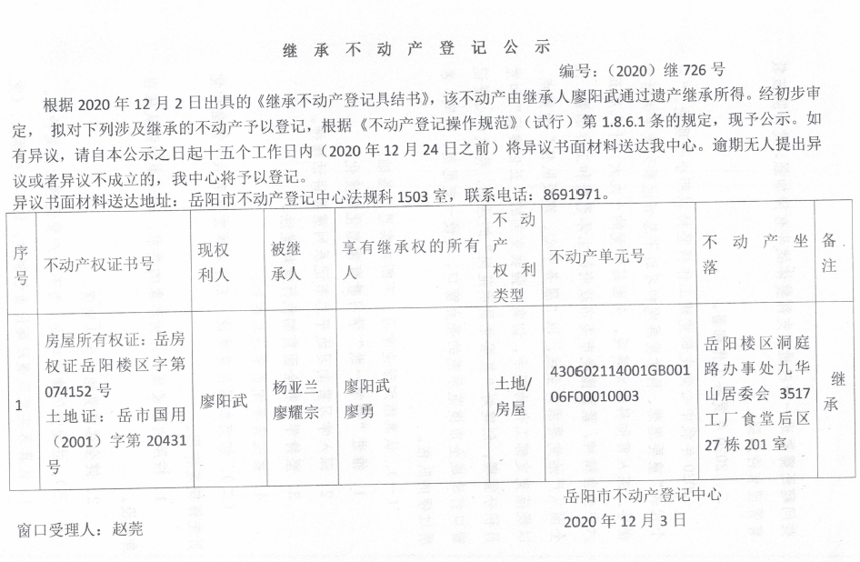 继承(受遗赠)不动产登记公告(廖阳武)