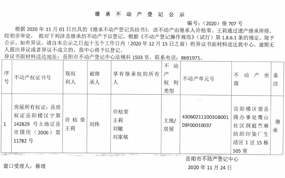 继承(受遗赠)不动产登记公告(王莉)