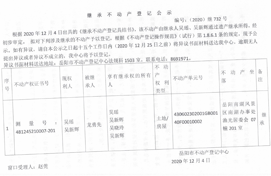 继承(受遗赠)不动产登记公告(吴瑶)