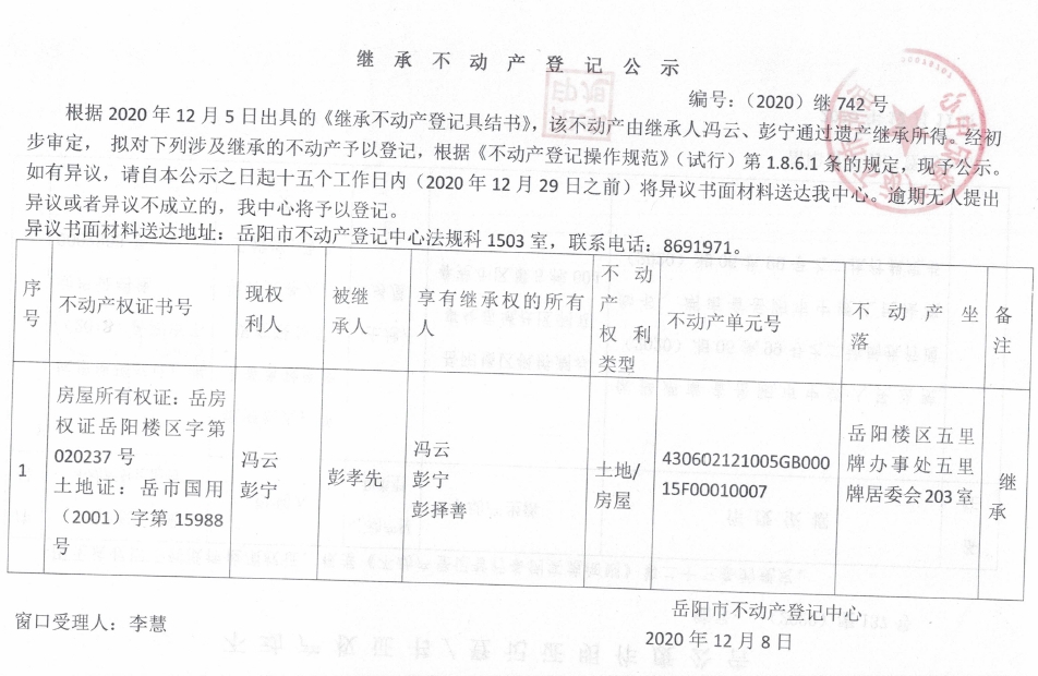 继承(受遗赠)不动产登记公告(冯云)