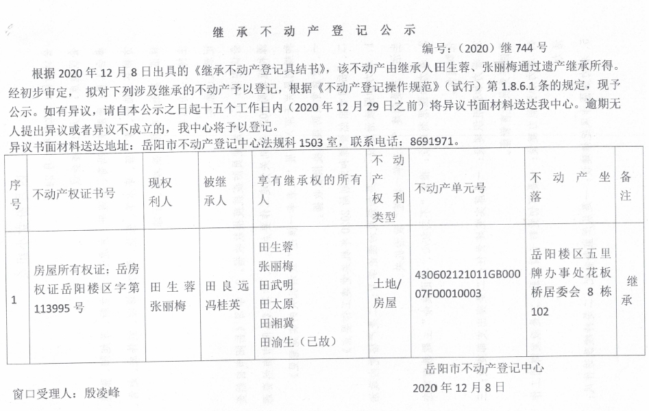 继承(受遗赠)不动产登记公告(张丽梅)