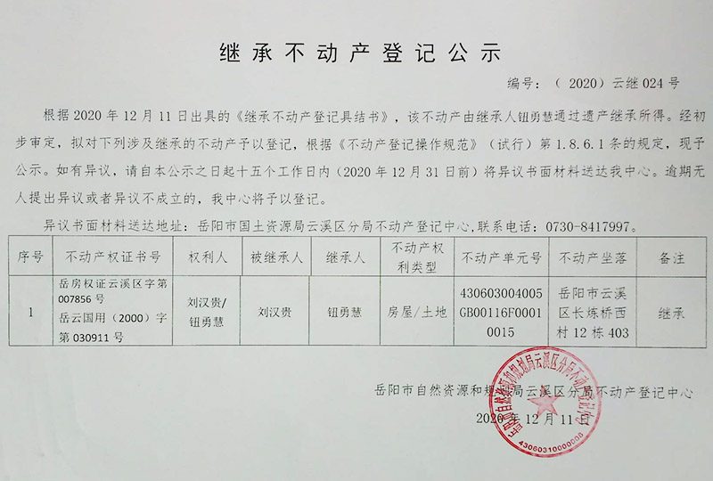继承(受遗赠)不动产登记公告(刘汉贵)